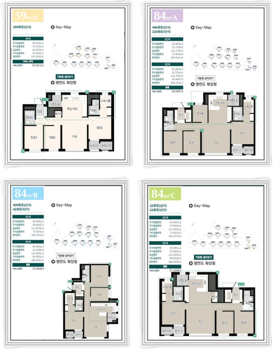 전 타입 모두 3~4베이 구조, 실거주 만족도 높은 설계를 적용할 것으로 보입니다. 59㎡ 소형 타입도 3룸 구성이라 신혼가구에 적합합니다.