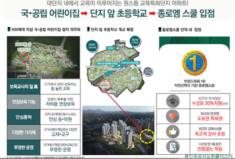 종로엠스쿨의 입점으로 자녀교육 시스템을 이용할 수 있는데요. 2년동안 30%지원해주는 시스템으로 수준 높은 교육을 지원해줍니다. 또한 용인중학교와 태성고등학교와 인접한 안심 학세권입니다.