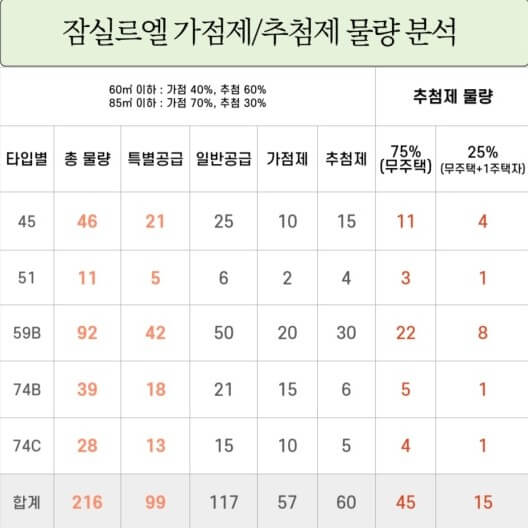 즉, 평형별 가점제/ 추첨제 물량은 아래와 같습니다.